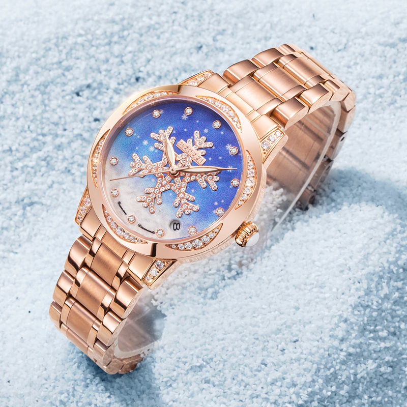 表(biao)殼:316L精(jing)鋼+電(dian)鍍真(zhen)玫瑰金,圈(quan)口:鑲54顆晶鉆
