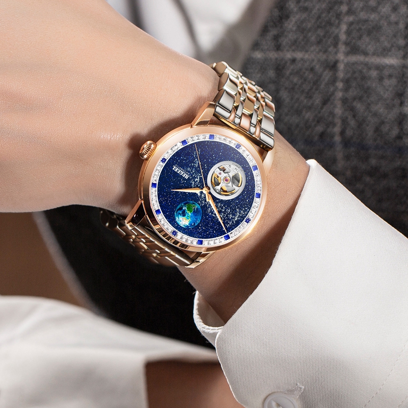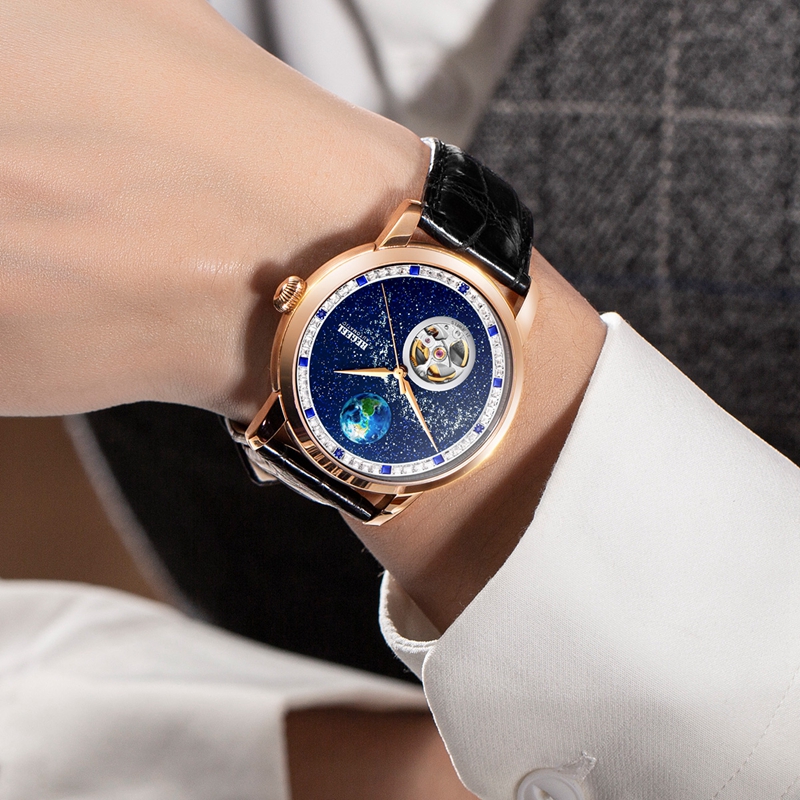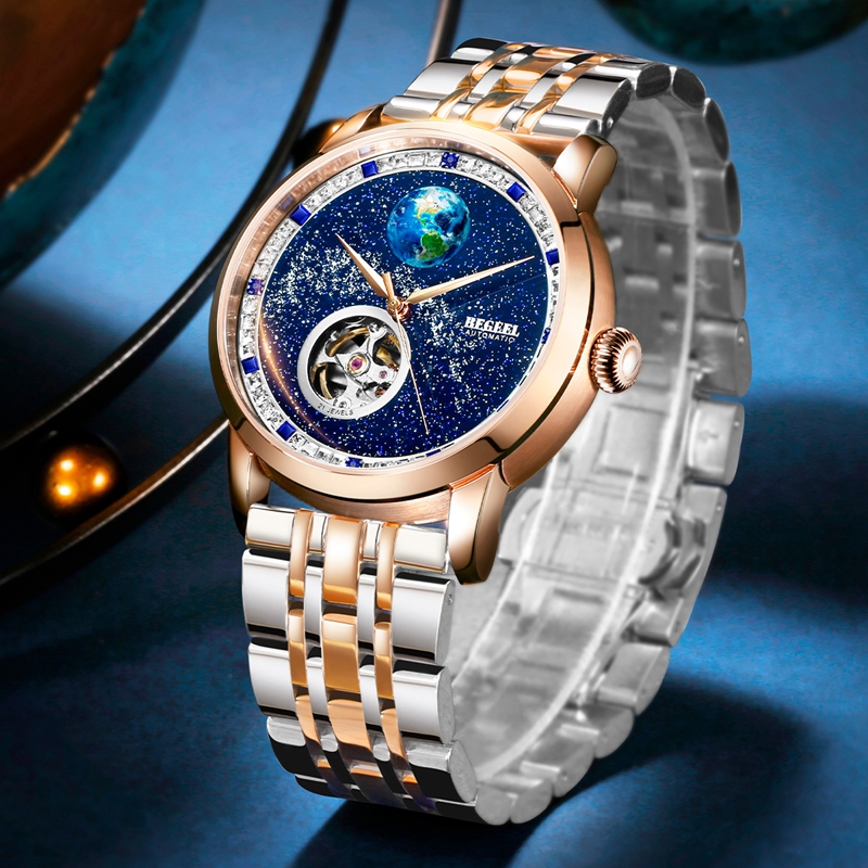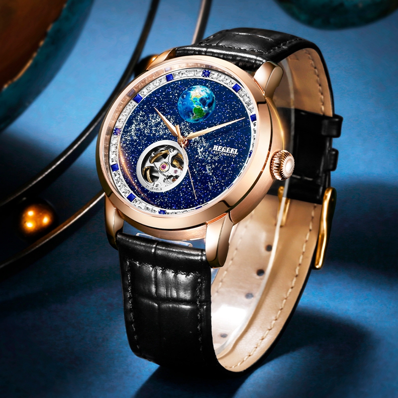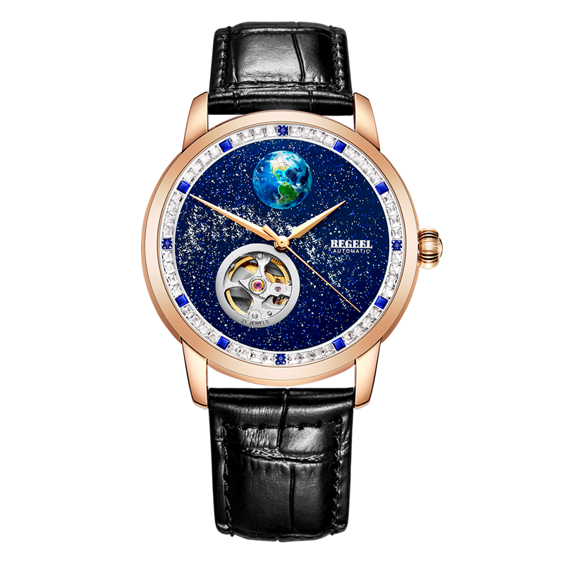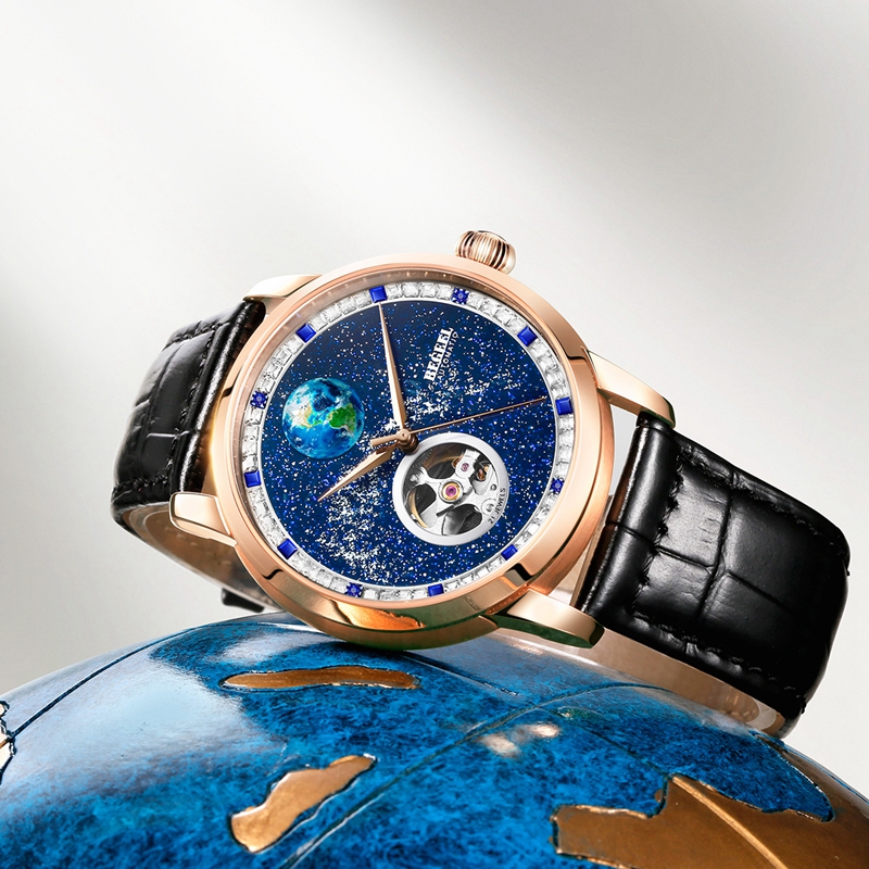 字面(mian):4顆真藍寶石(約0.04ct), 鑲約48顆白色方鋯石,8顆藍色方鋯石,星空面(mian)浮(fu)雕地球