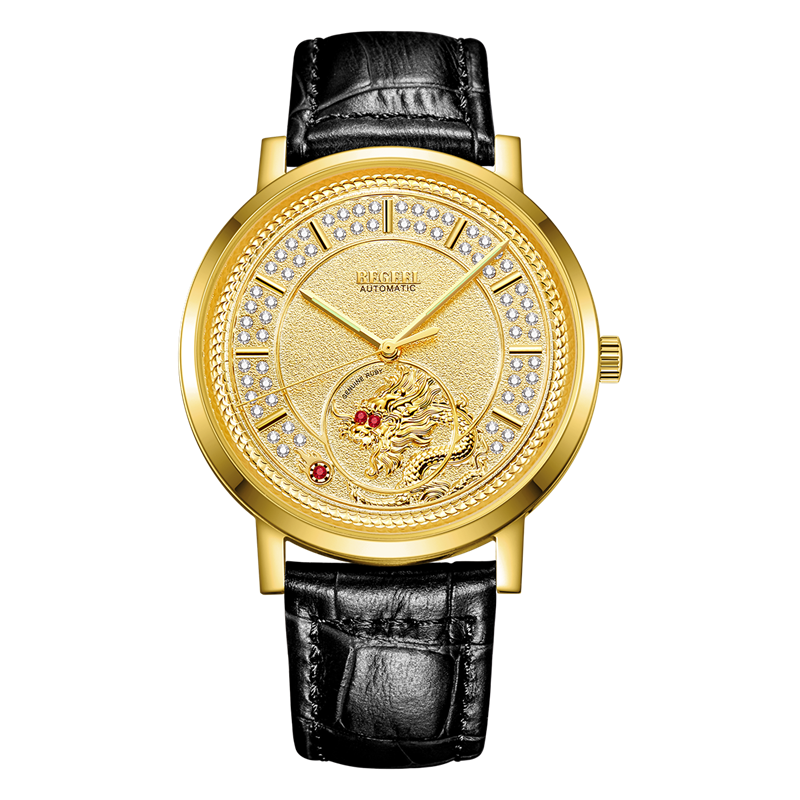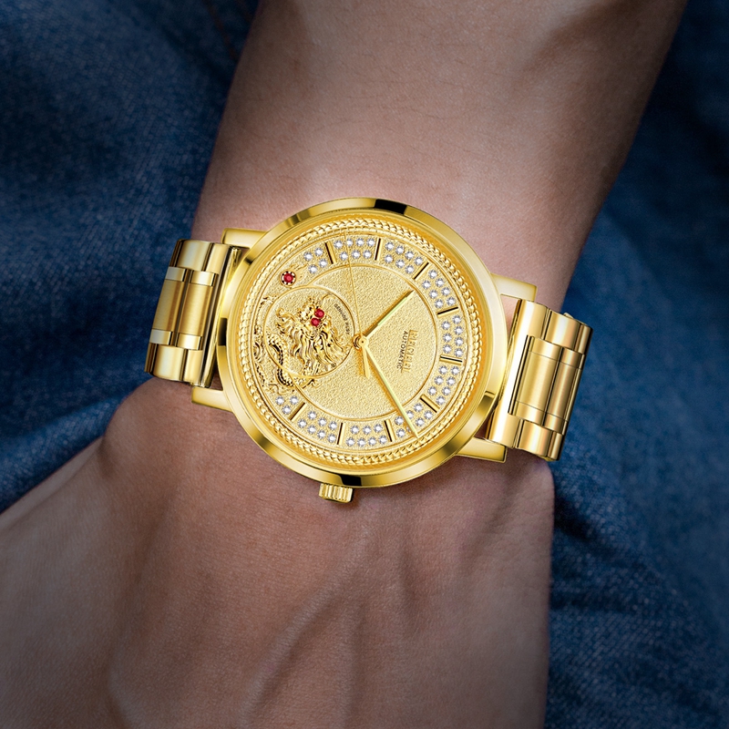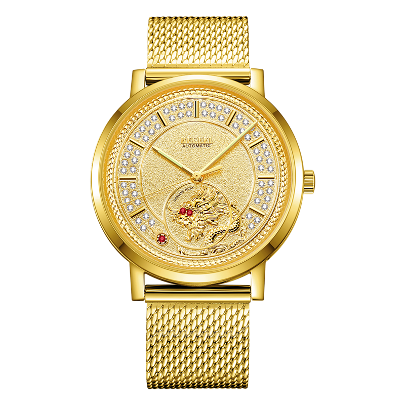 字面:雙紋(wen)理設計 外圈(quan)龍鱗紋(wen),內部金沙紋(wen)雕龍,字面電鍍(du)真金,真釘刻度,鑲(xiang)1顆(ke)真紅寶石,約0.001ct,鑲(xiang)63顆(ke)晶鉆,2顆(ke)紅剛玉,夜光針