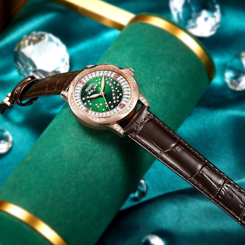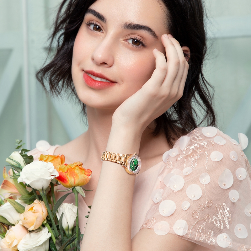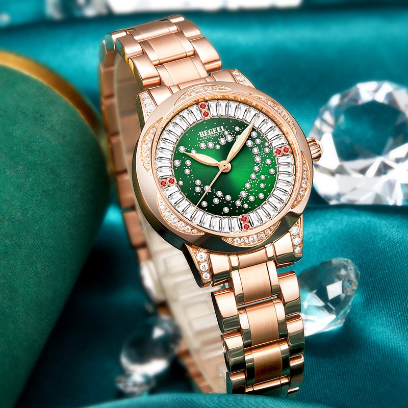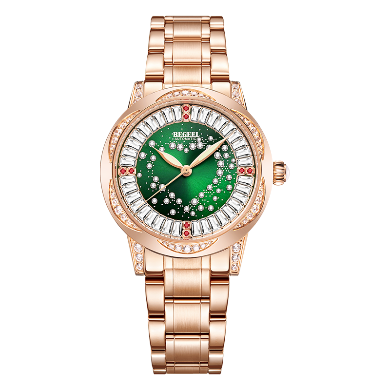 表殼:316L精鋼+電(dian)鍍真玫瑰金,圈(quan)口鑲54顆晶鉆