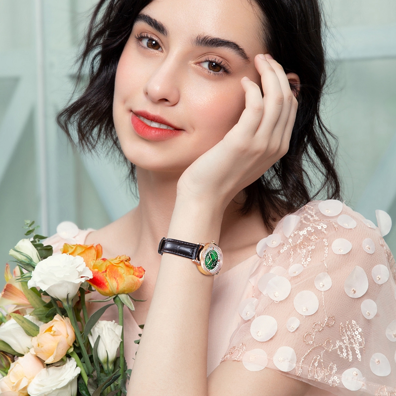 字(zi)面(mian)(mian):心形太陽紋綠(lv)面(mian)(mian),鑲36顆梯形晶鉆,約42顆晶鉆,8顆真紅寶(bao)石(shi)