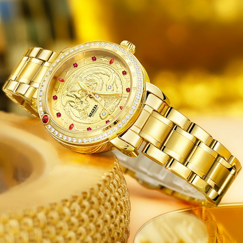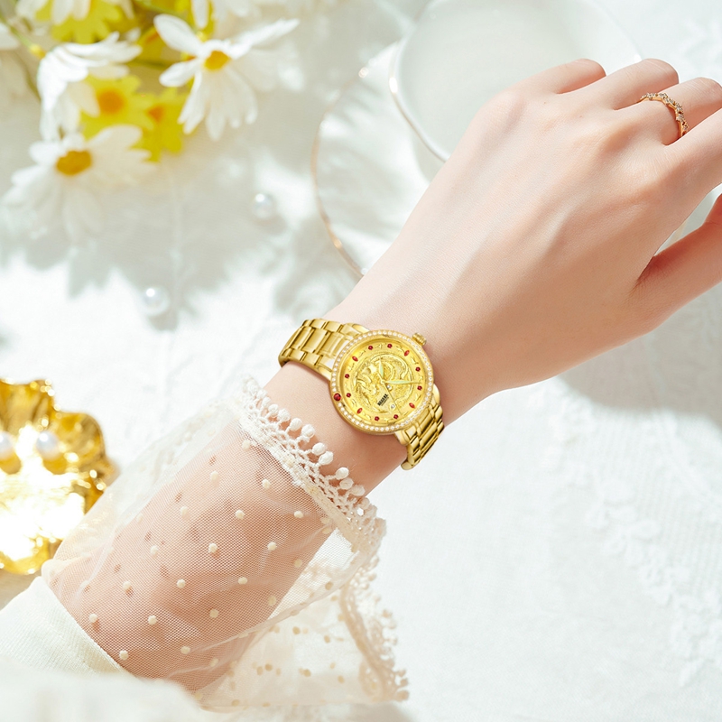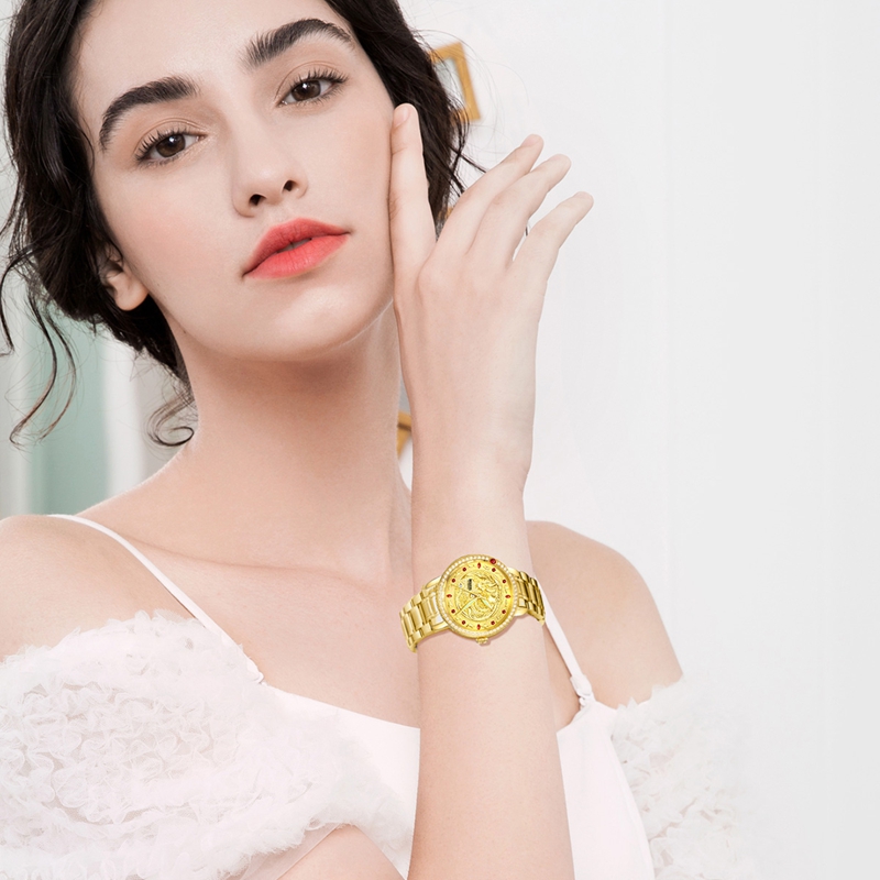 表(biao)殼:316L精鋼電鍍金,鑲57顆(ke)晶(jing)鉆,1顆(ke)Big合成紅寶石