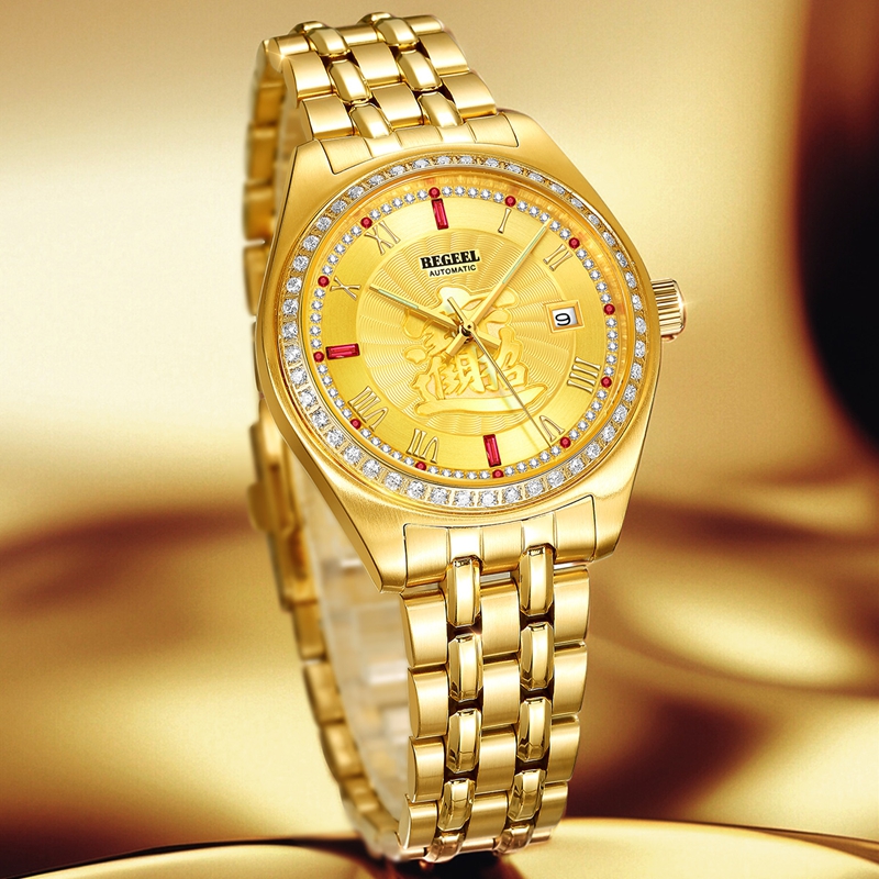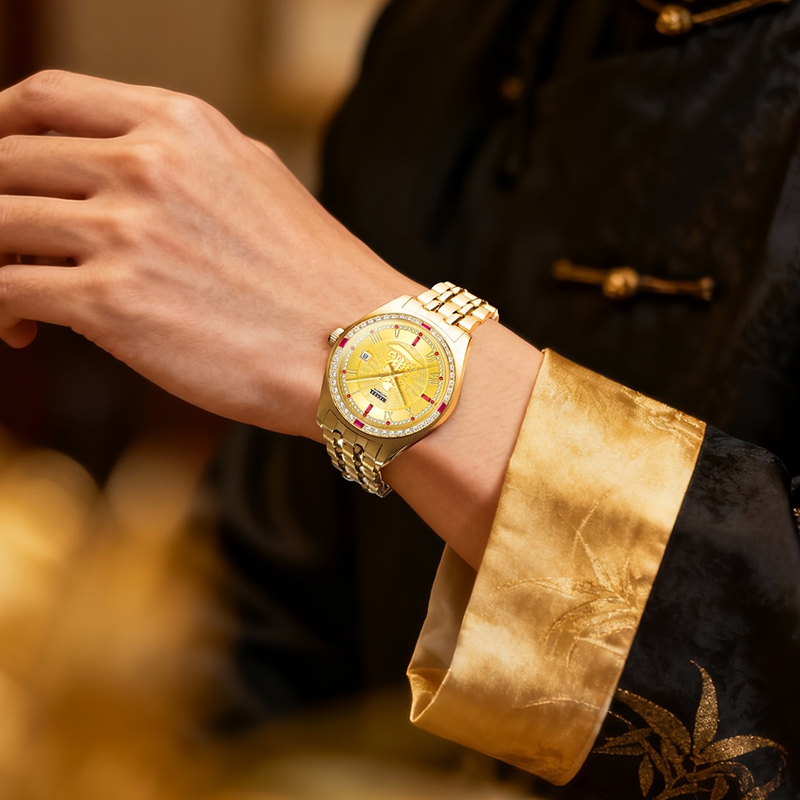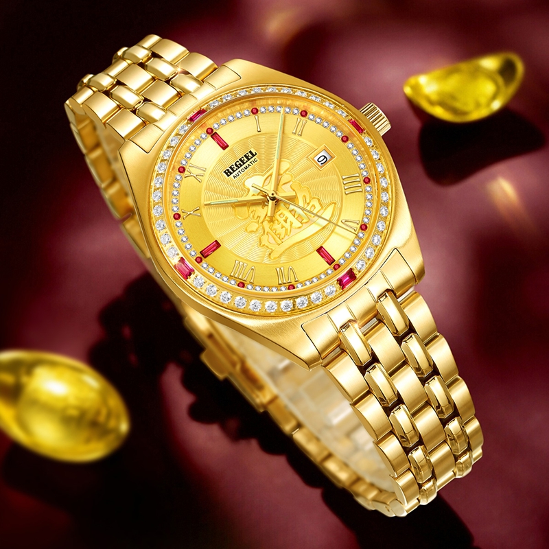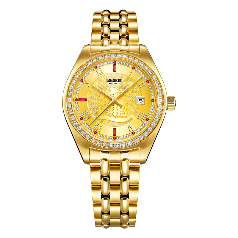 字面:1顆真紅寶石,雕刻招財進寶,中間風車紋,外面拉直沙,11顆合成紅寶石,3顆方石合成紅寶石,60顆晶鉆,夜光指針