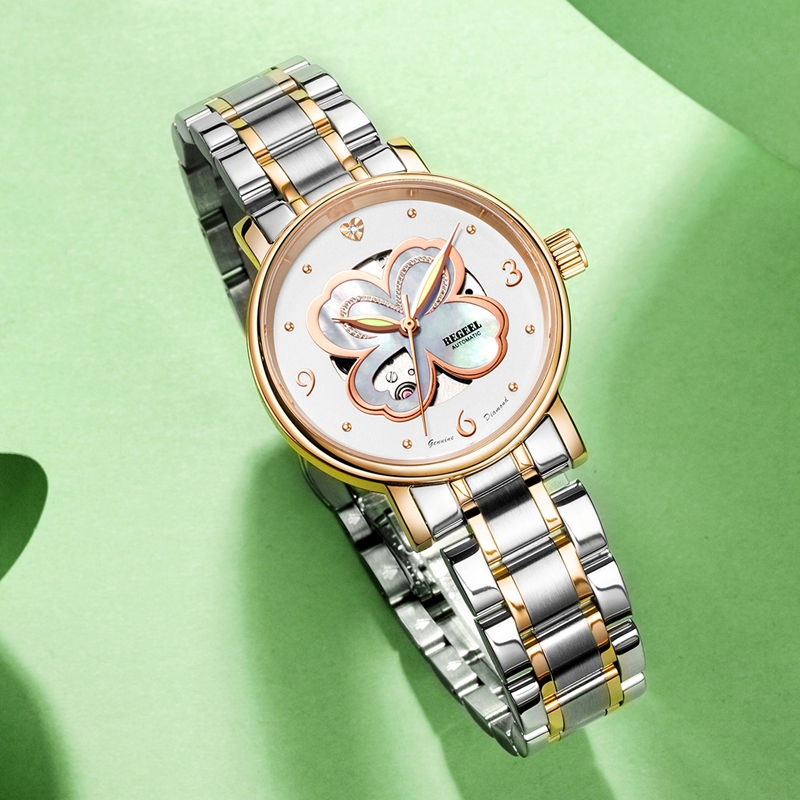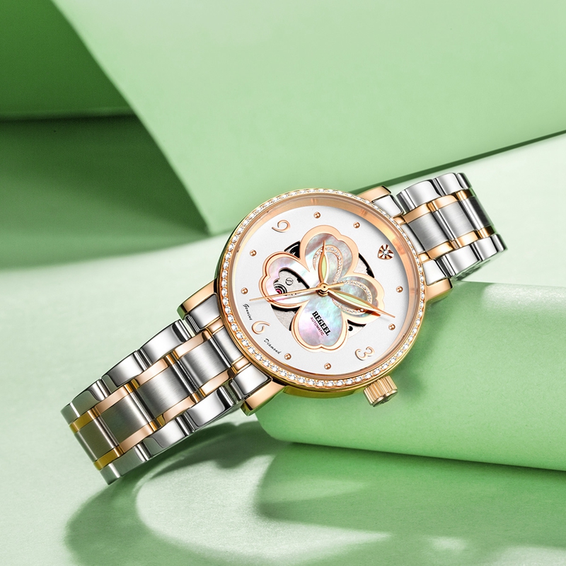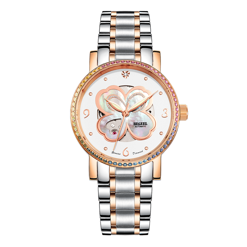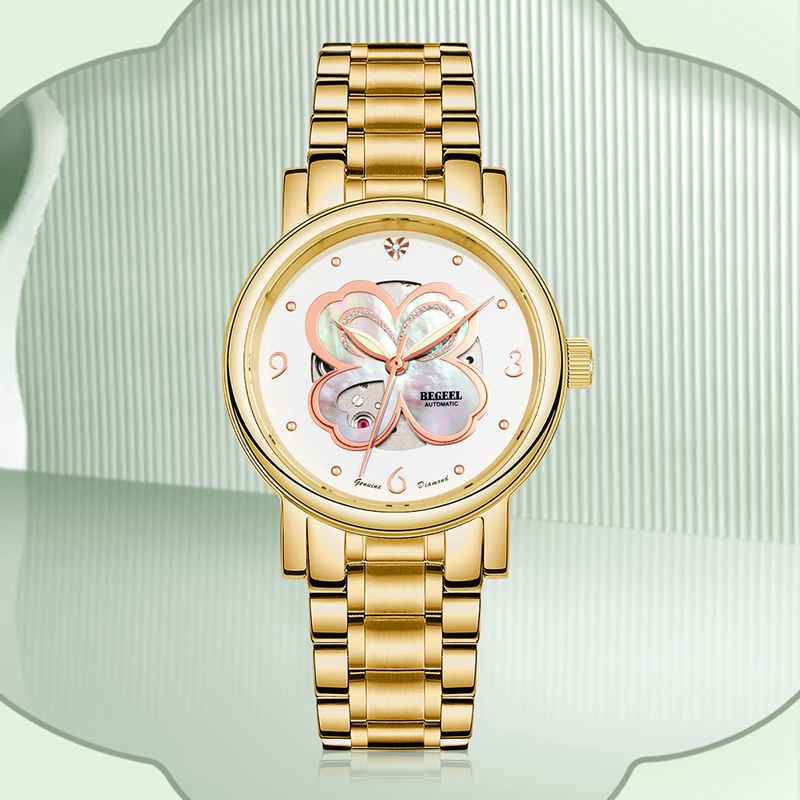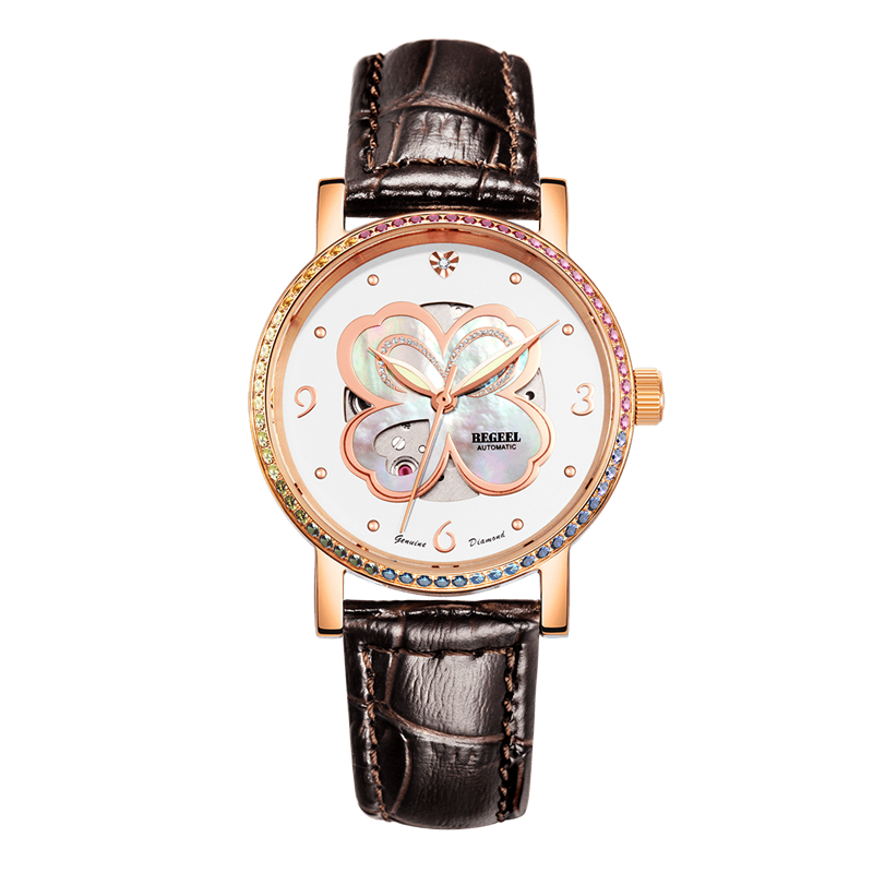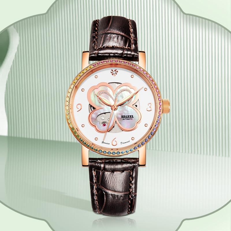 字面:四葉(xie)草鏤(lou)空珍珠(zhu)母貝字面,絲(si)印logo, 1粒(li)鉆石,鋯石鑲嵌表殼(ke)/玫(mei)瑰金(jin)表殼(ke)