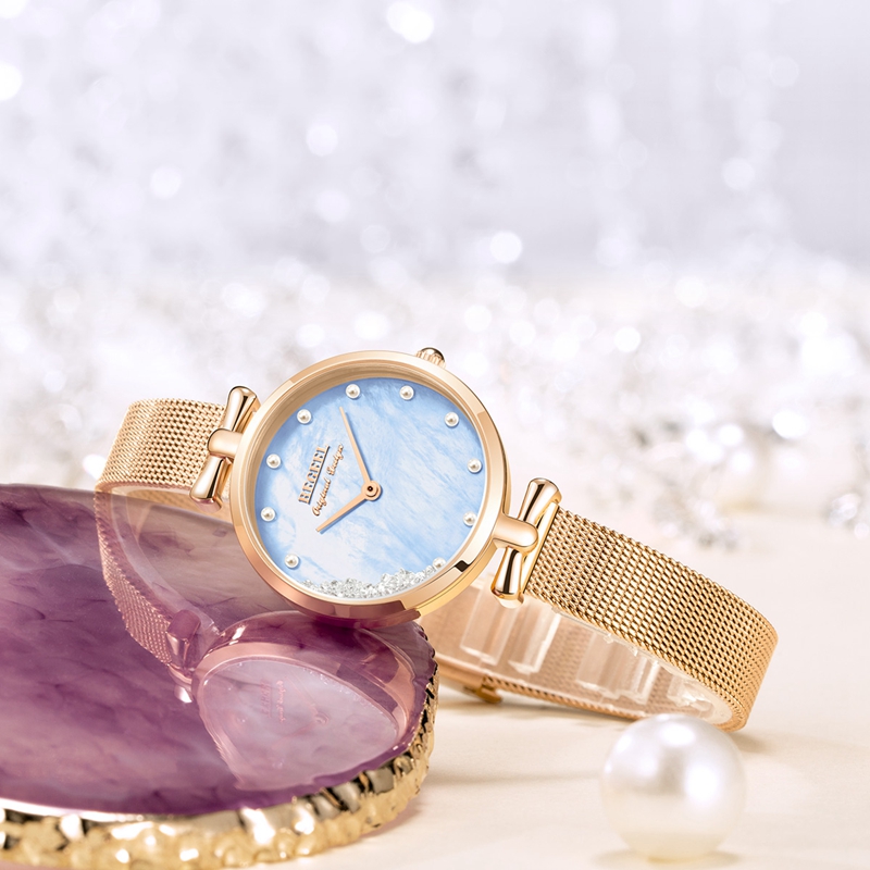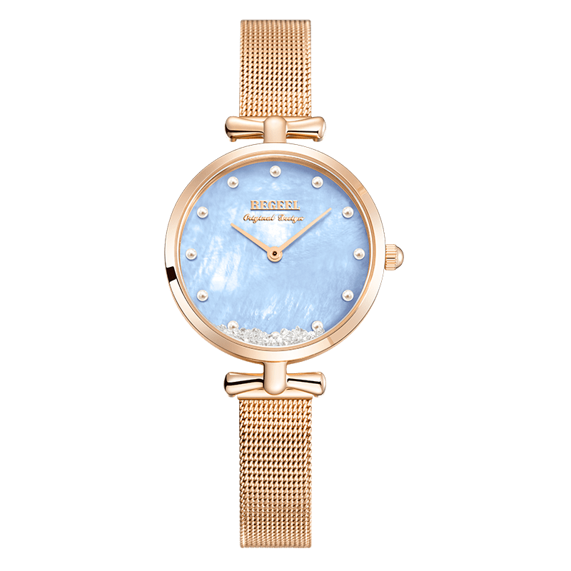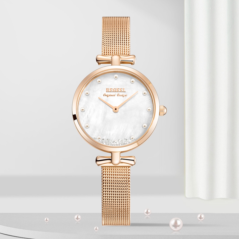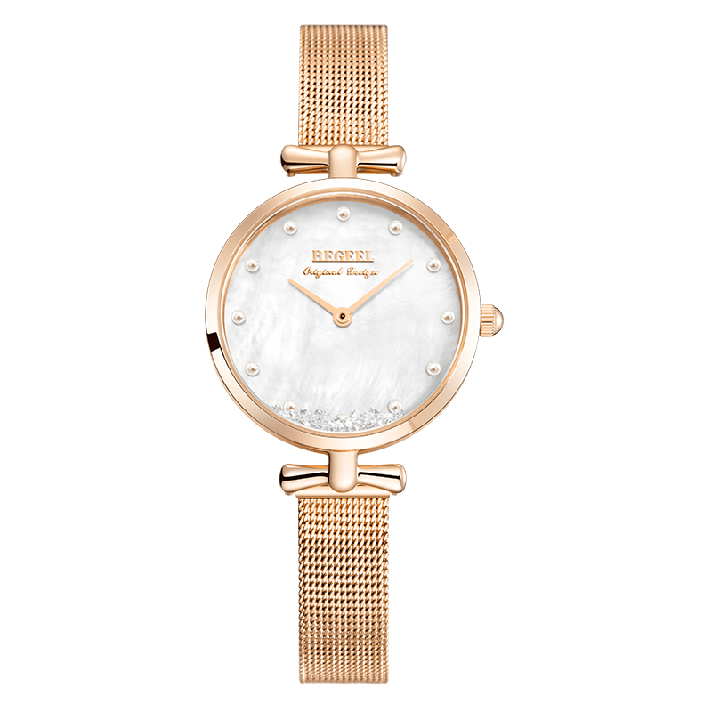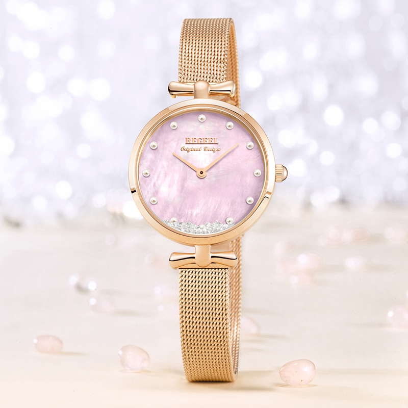 表殼(ke):316L鋼+電鍍玫瑰金(jin), 蝴蝶結(jie)耳位設(she)計, 雙層玻(bo)璃(li)結(jie)構(gou)