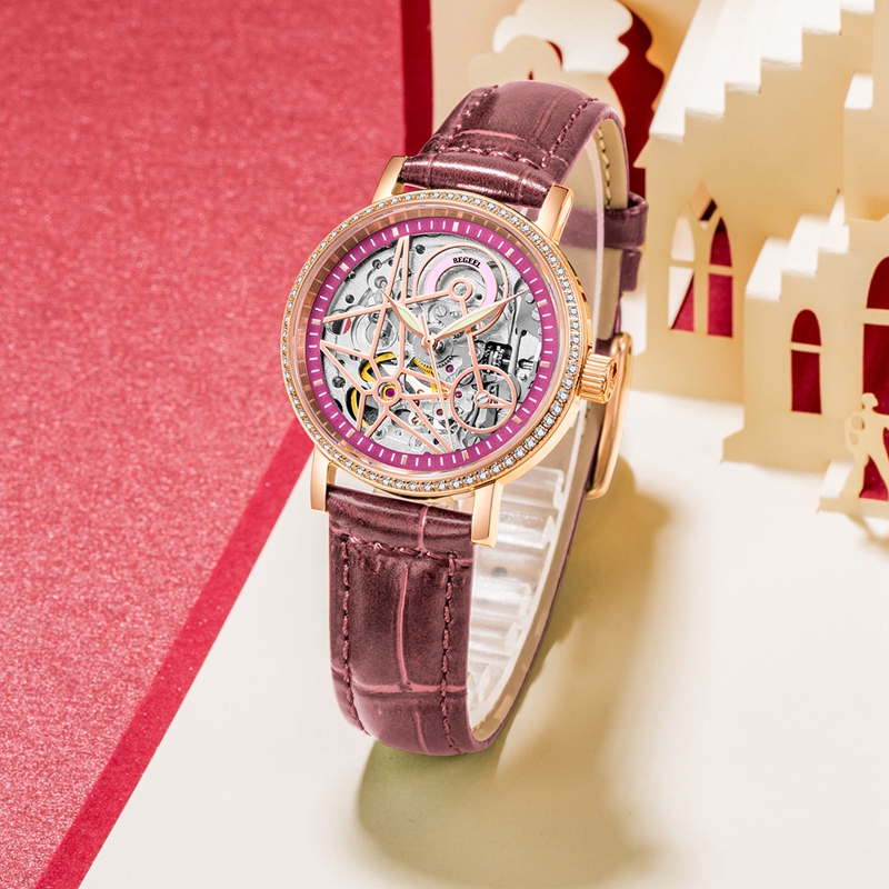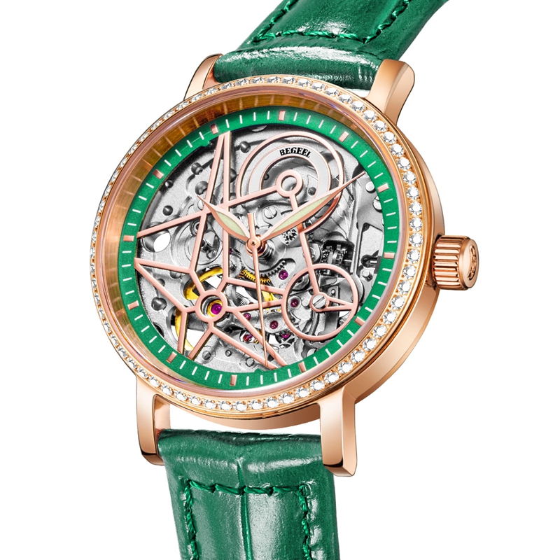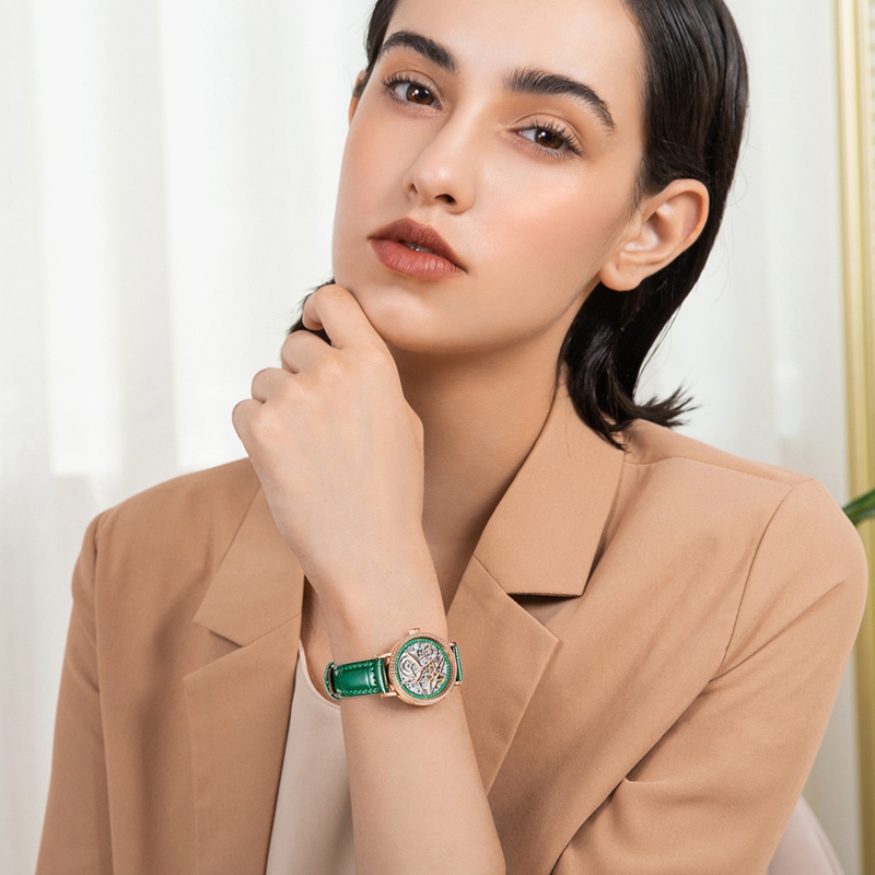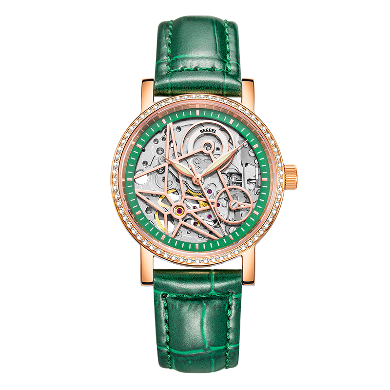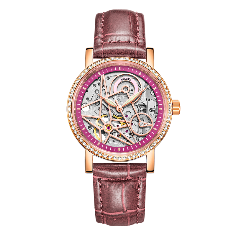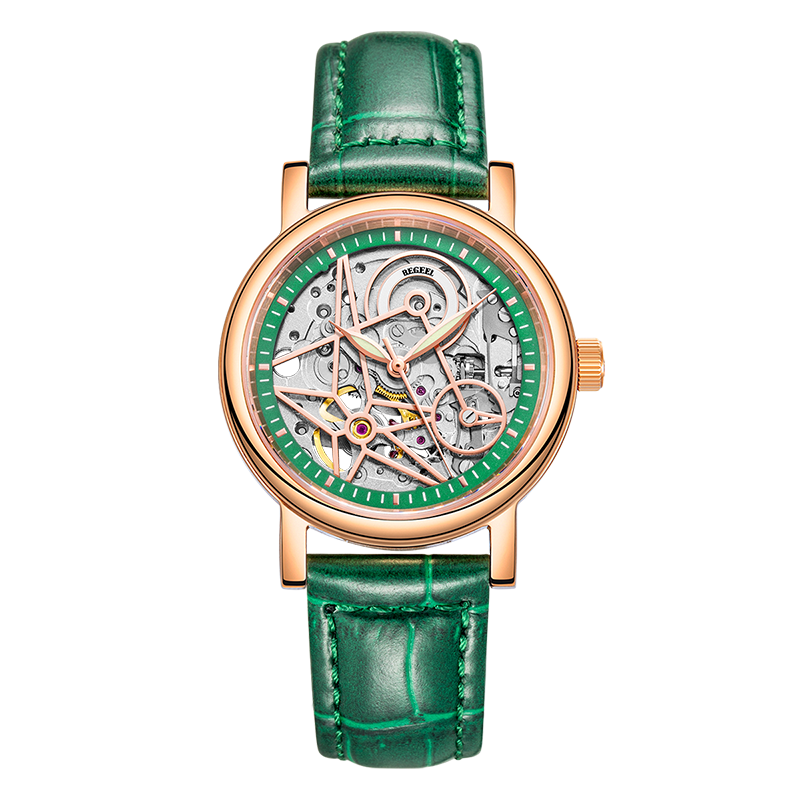 表帶:316L精鋼電鍍(du)玫瑰(gui)金/酒紅(hong)/綠(lv)色竹(zhu)節(jie)紋牛皮(pi)帶