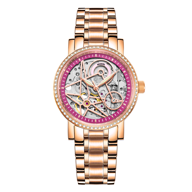 表殼(ke):316L精(jing)鋼+電鍍玫(mei)瑰金,鑲(xiang)65顆合成白色(se)鋯(gao)石/光圈(quan)