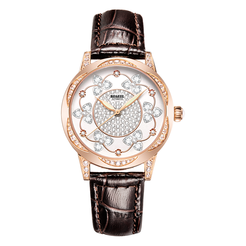 表(biao)帶(dai):316L精鋼+電鍍真玫瑰金/咖色牛(niu)皮(pi)