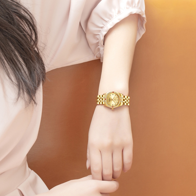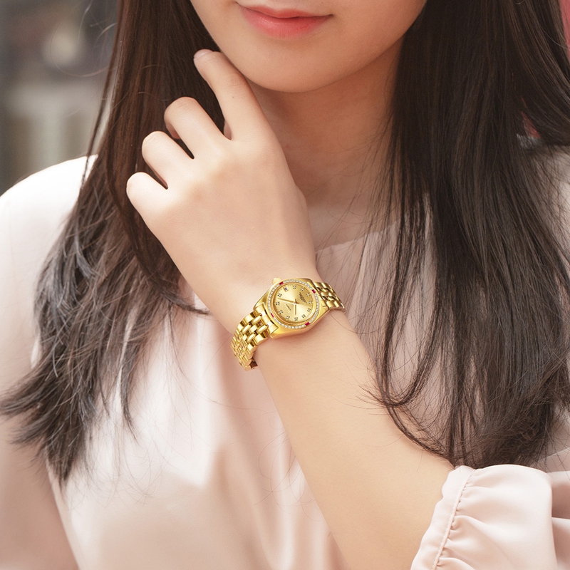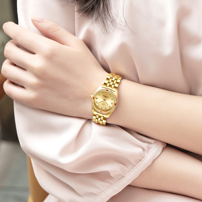 表殼:316L精鋼+電(dian)鍍真金,鑲36顆晶(jing)鉆(zhan), 4顆紅(hong)方晶(jing)鉆(zhan)