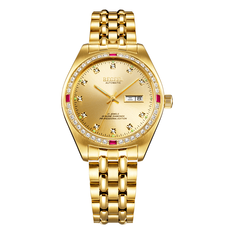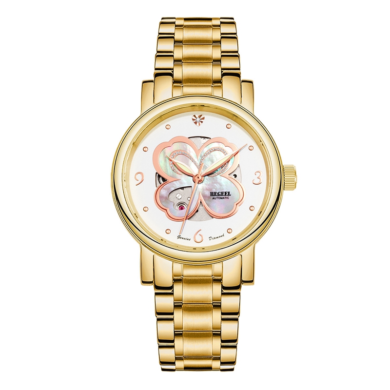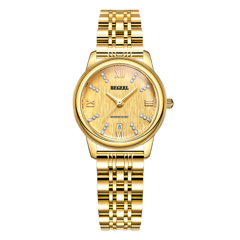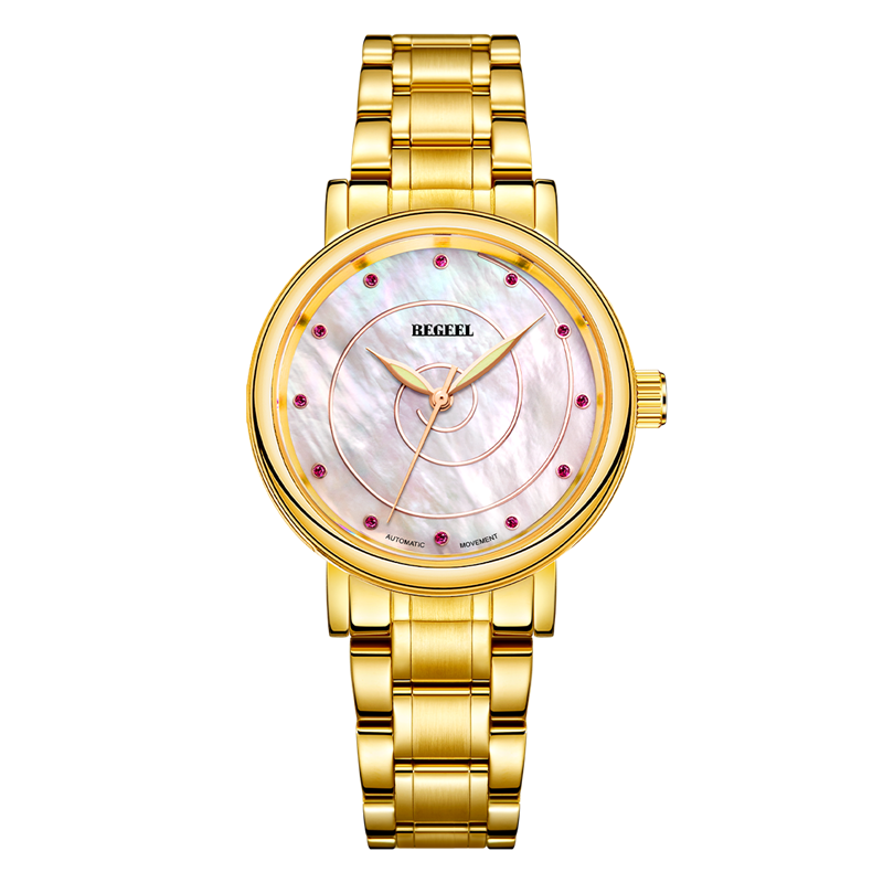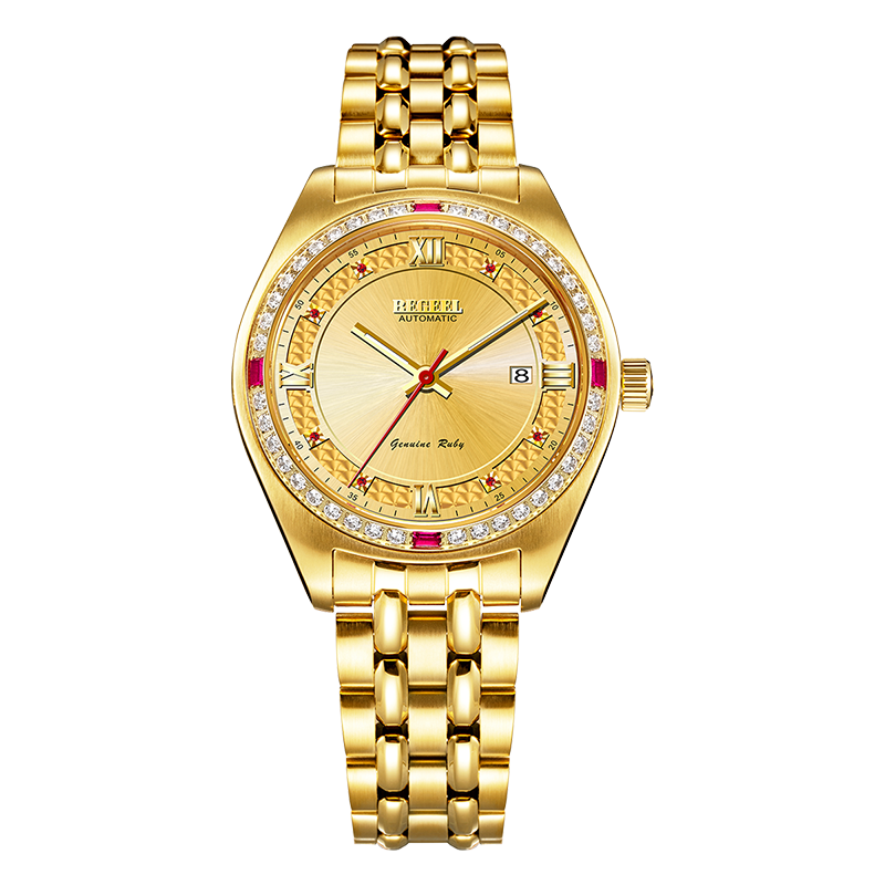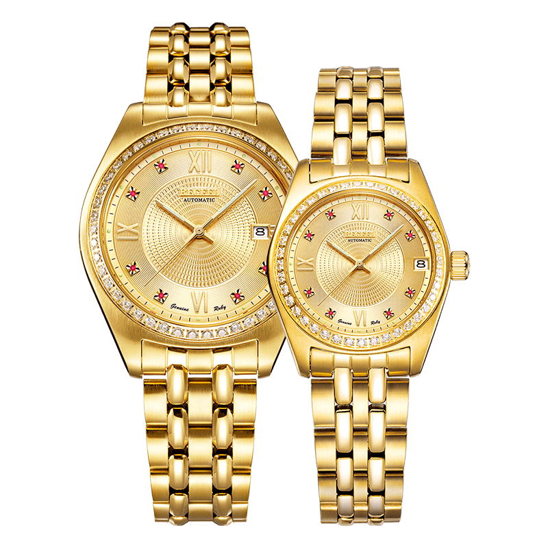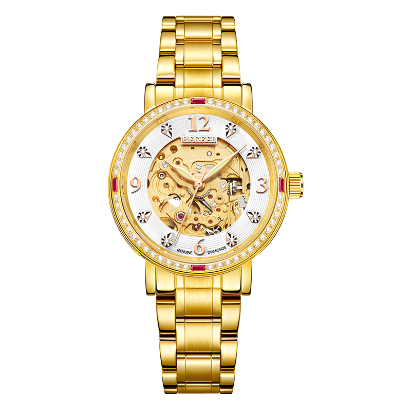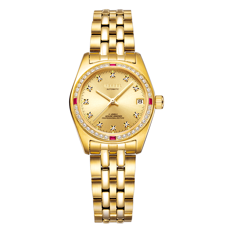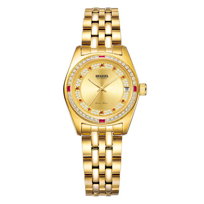 表殼:316L精鋼+電鍍真金 (圈(quan)口鑲(xiang)55水(shui)晶鉆,耳位(wei)鑲(xiang)20顆晶鉆)