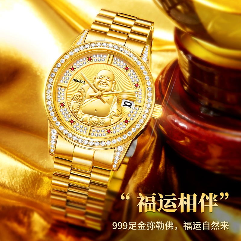 字面:999足金彌勒(le)佛,鑲84顆晶(jing)鉆(zhan),8顆真(zhen)紅寶石, 放射紋理設計