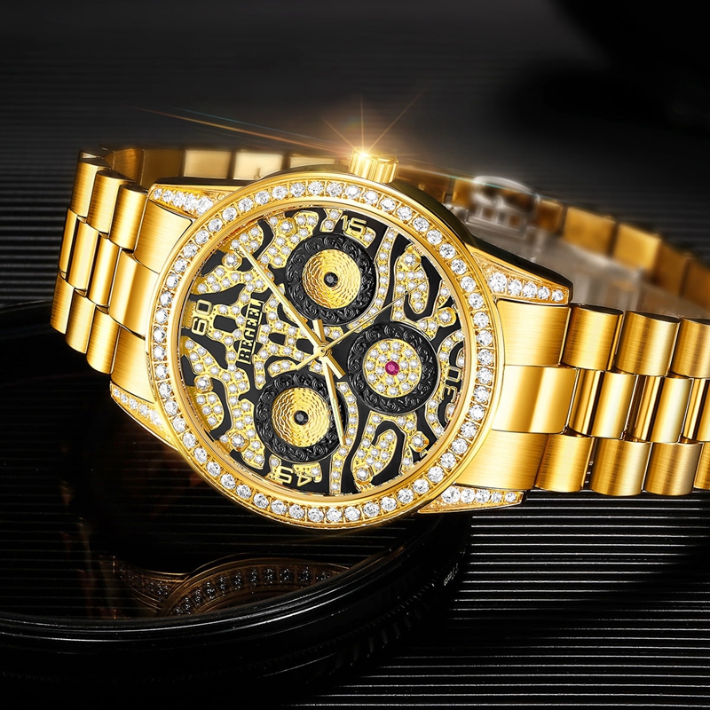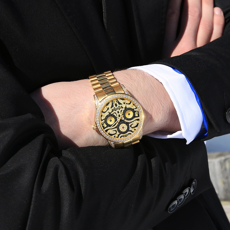 表殼:316L精鋼+電鍍(du)真(zhen)金(jin) (圈口鑲55水晶(jing)鉆(zhan),耳位鑲20顆晶(jing)鉆(zhan))