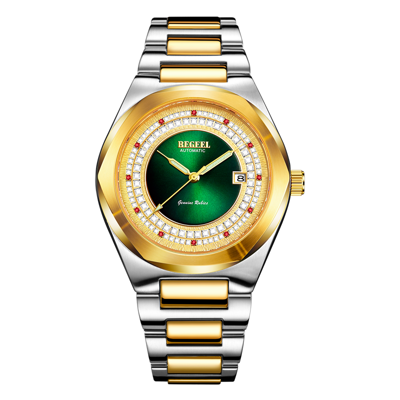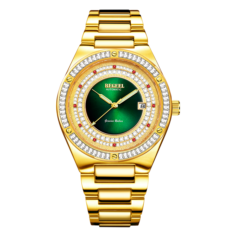 字面:雙(shuang)紋(wen)(wen)(wen)理,金色流沙紋(wen)(wen)(wen)和綠色太(tai)陽紋(wen)(wen)(wen),鑲約(yue)105顆方(fang)晶(jing)鉆,12顆真(zhen)紅寶石 約(yue)0.012ct, 強夜光針(zhen)