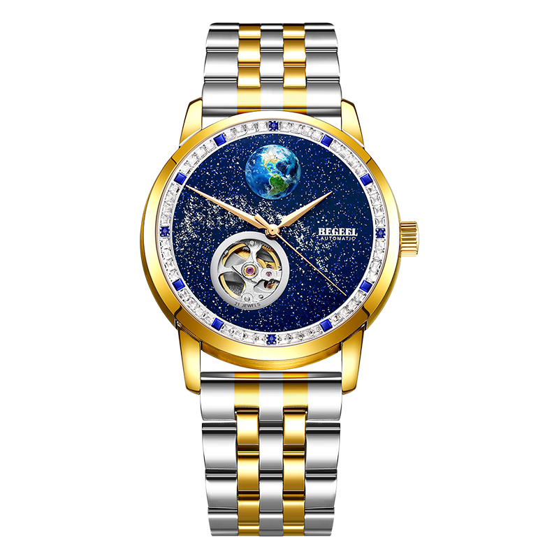 字面:4顆(ke)真藍寶(bao)石(shi)(約(yue)0.04ct), 鑲約(yue)48顆(ke)白色方(fang)鋯石(shi),8顆(ke)藍色方(fang)鋯石(shi),星(xing)空面浮雕地球