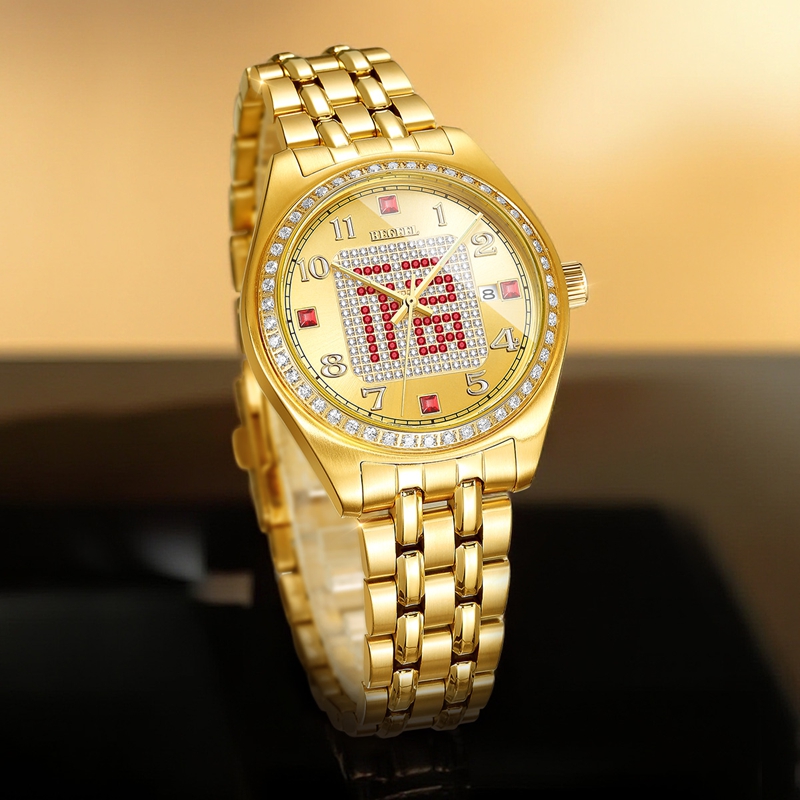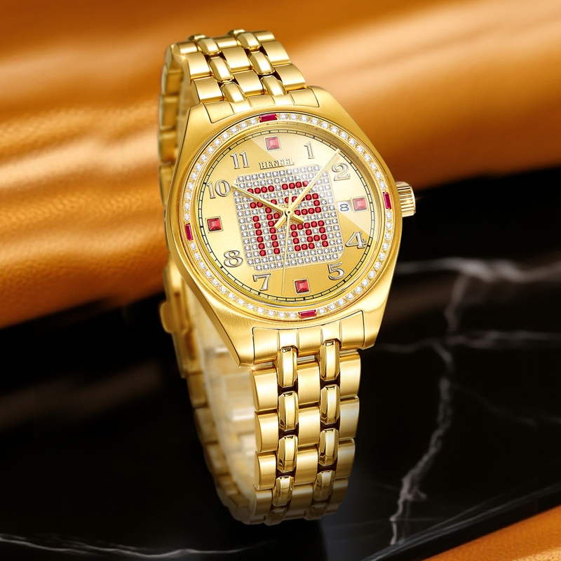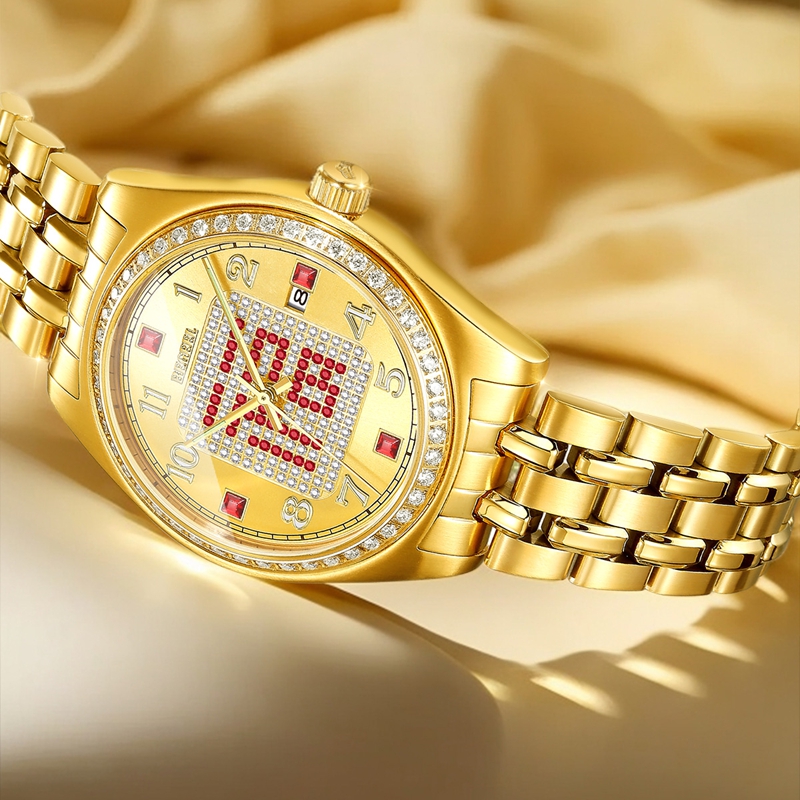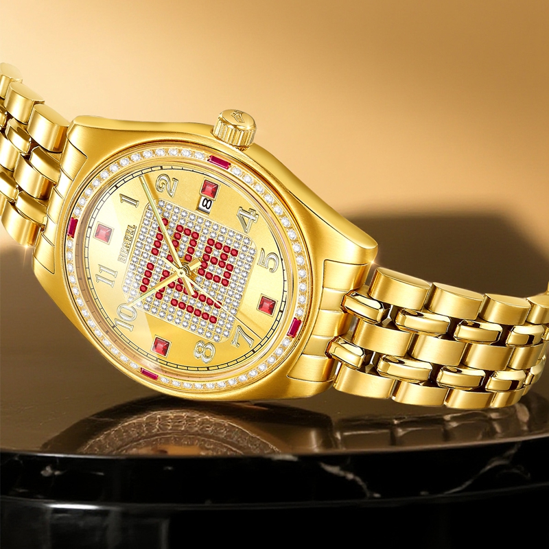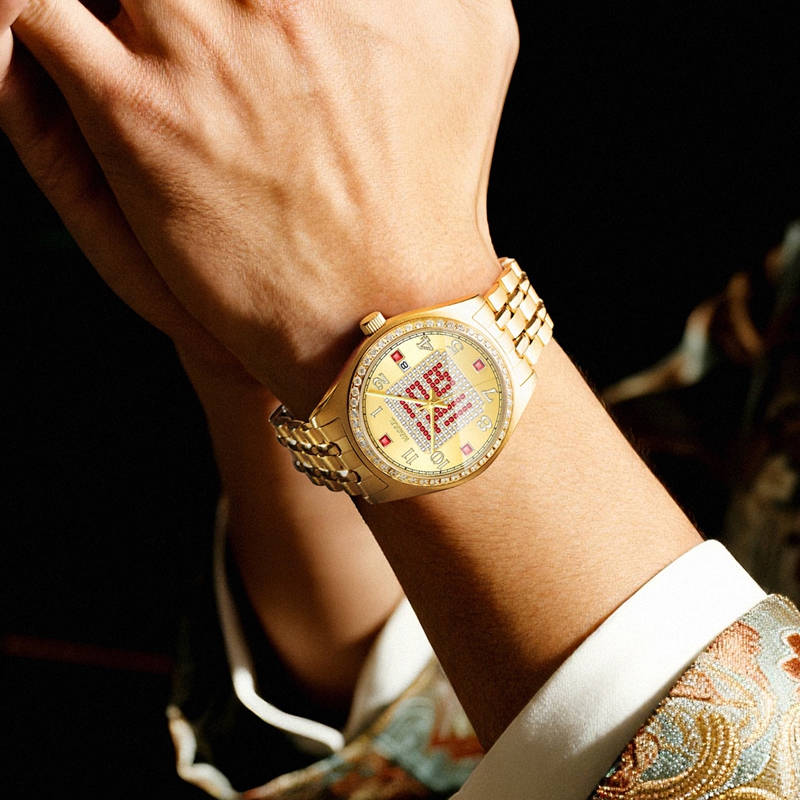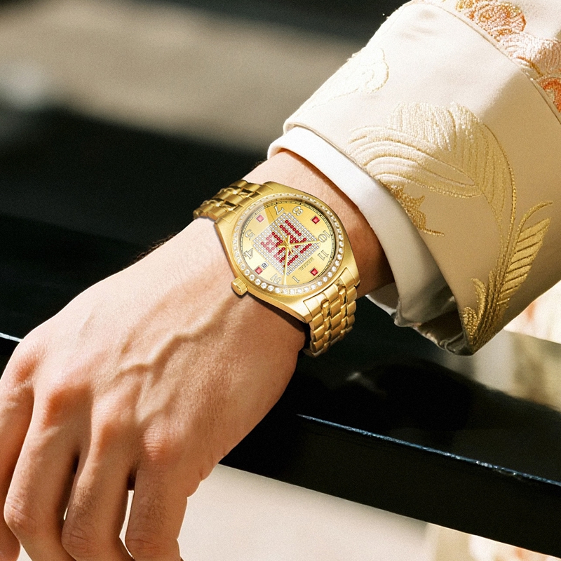 字面:太陽紋金面,滿天星紅福字,鑲2顆真紅寶石,52顆合成紅寶石,4顆合成紅寶石方石,132顆晶鉆,夜光阿拉伯數字,夜光指針