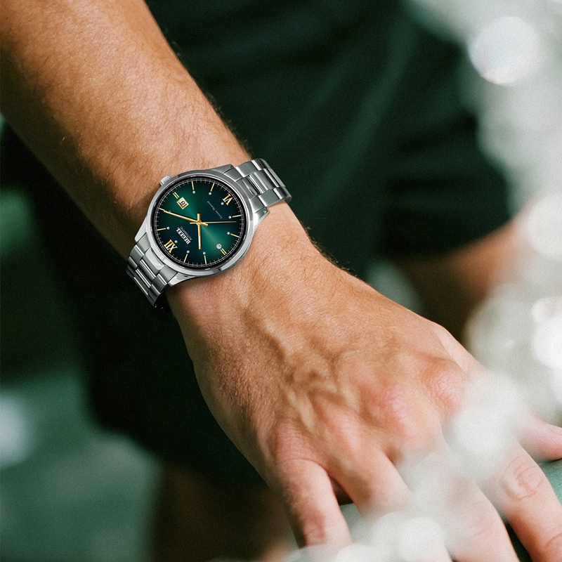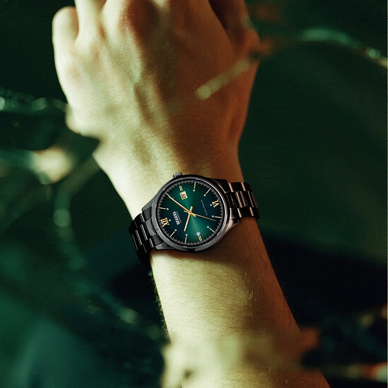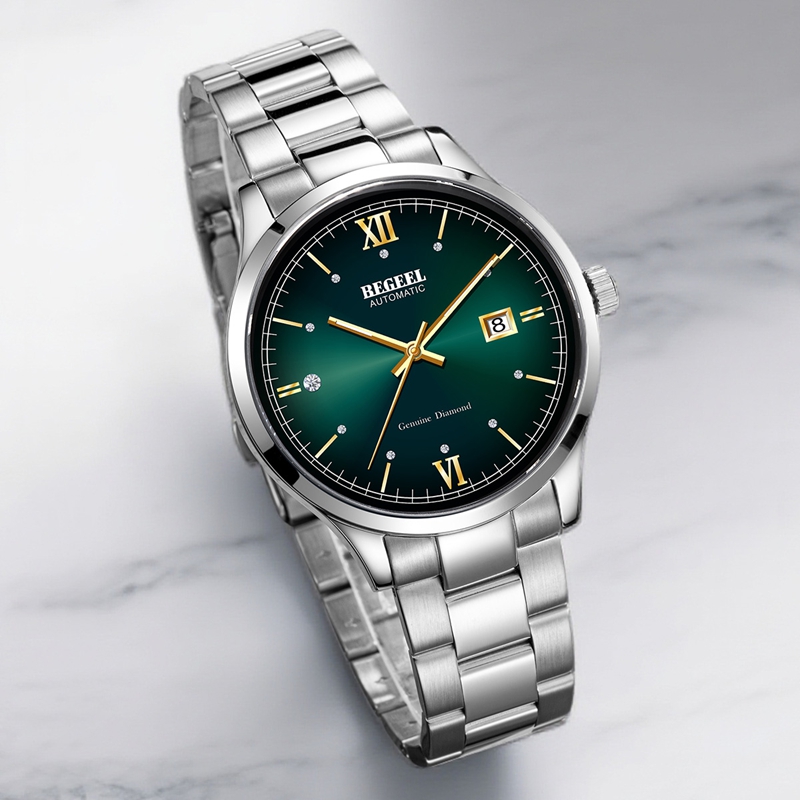 字面:12點位置1顆真鉆,9點位置1顆真托帕石,刻度位置9顆晶鉆,豹眼(yan)紋綠面 ,夜光三針設計