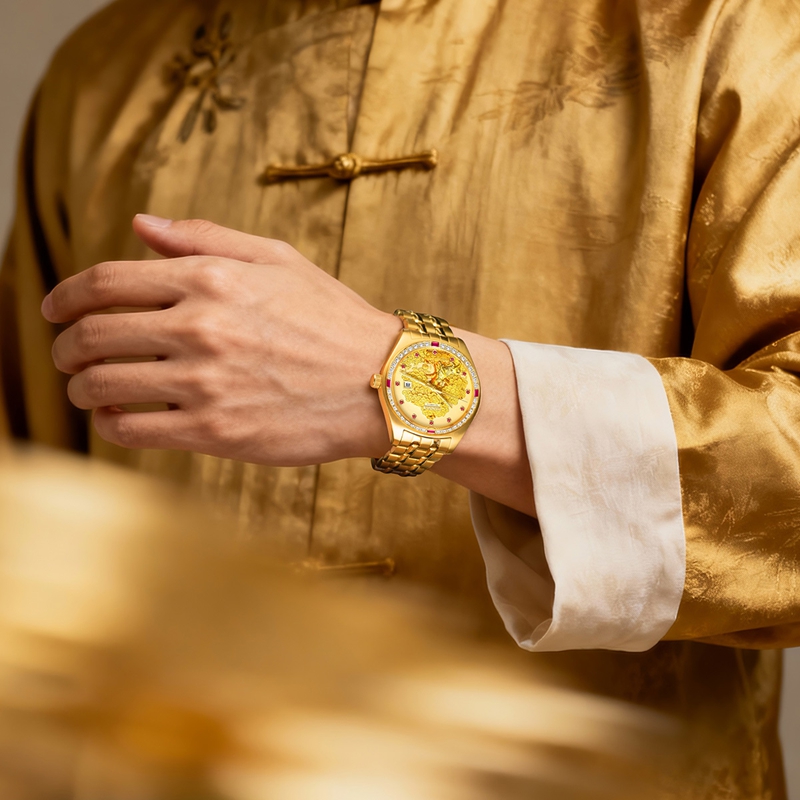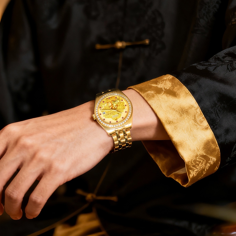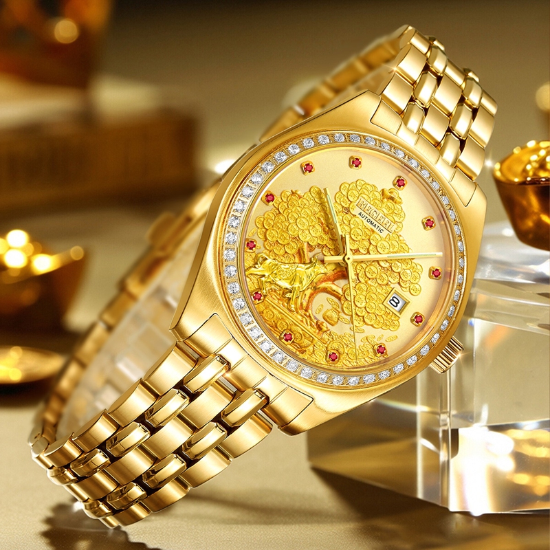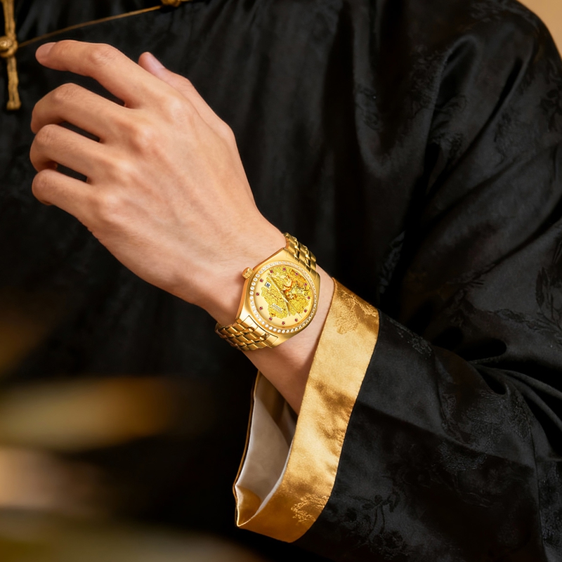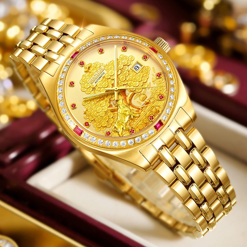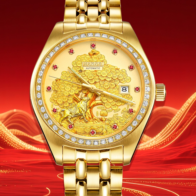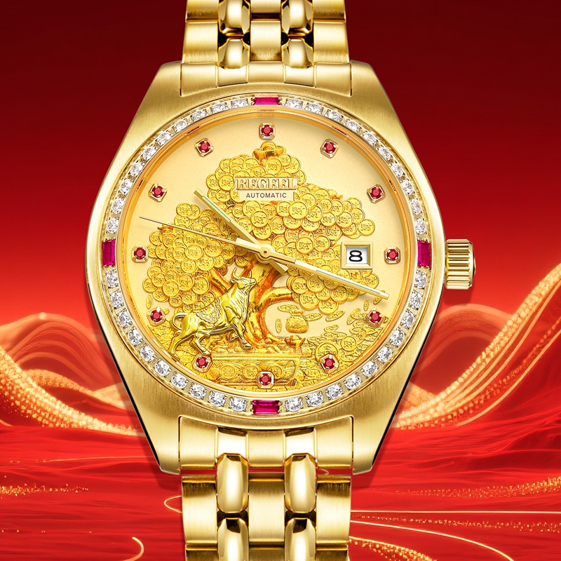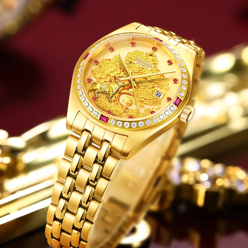 字面:雕刻金錢樹,浮雕金牛(鍍真金),鑲1顆真紅寶石(12時),磨砂金面,11顆合成紅寶石,夜光指針