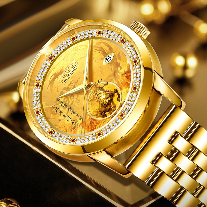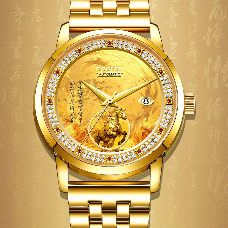 字(zi)面(mian):1顆真紅寶石(12時)其他刻度11顆紅晶鉆,鑲(xiang)約120顆晶鉆,浮雕戰馬,火焰(yan)紋理,夜光針